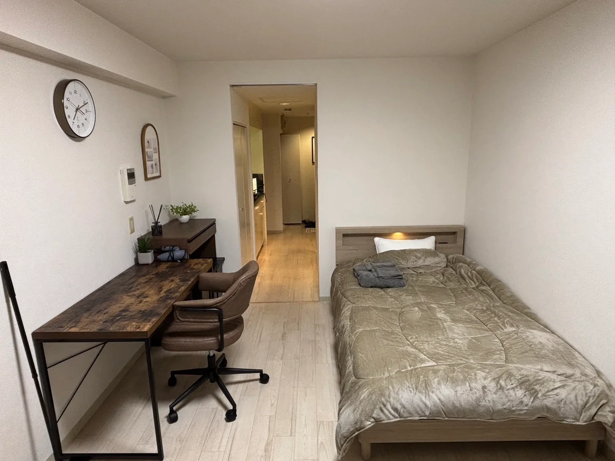 The room is a slightly larger 1K type, and is fully equipped with all the necessary furniture and appliances, air conditioning for the hot summers of today, a heater for comfortable living in Hokkaido's winters, and security with an auto-lock system, so there are no problems.